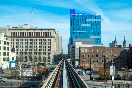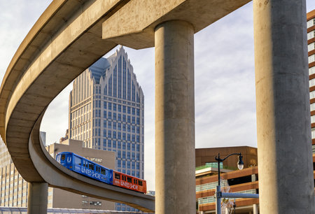 Detroit, Michigan, USA - November 23, 2018: The Detroit People Mover (DPM) is a 2.94-mile automated people mover system which operates on a single track, and encircles Downtown Detroit, Michigan.