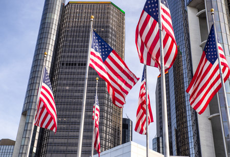 Detroit, Michigan, USA - November 23, 2018: The Renaissance Center (RenCen) skyscrapers surrounded by American Flags in Downtown Detroit, Michigan