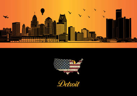 Detroit skyline silhouette - illustration, Town in orange background, Map of USA