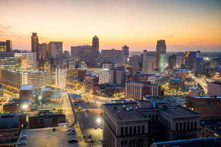 Aerial view of downtown Detroit at twilight in Michigan USA