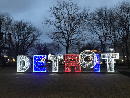Detroit sign at Grand Circus Park. Detroit, Michigan, United States.