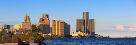 Detroit, MI USA - 8/30/2020: panoramic view of Skyline of Detroit downtown under evening sun light