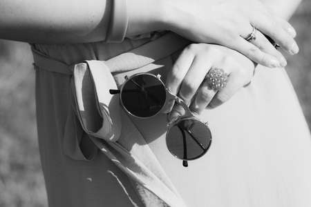Steampunk sunglasses model held in hand with round lenses retro flip up model close up shoot in a summer day. Selective focus