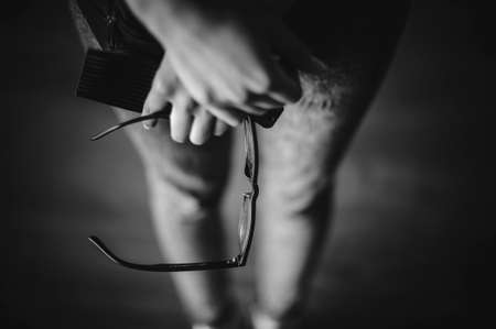 Eyeglasses, Clear Glasses, Black Frame Fashion Vintage Style, Hand Holding Rustic Still Life Style.