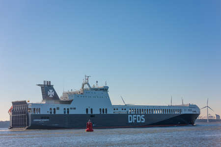 Hoek van Holland, the Netherlands - January 20 2019: car passenger ferry ship DFDS Gardenia seaways sailing out of port Rotterdam past Hoek van Holland and Maasvlakte harbour