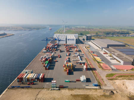 Westzaan, 9th of October 2021, The Netherlands. Container docking and logistics facility Aerial drone view along the Noordzeekanaal. near Zaandam and Amsterdam.