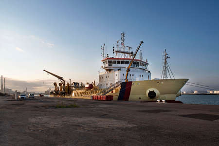 Industrial ship moored at the quay in the port of Le Havre in France with cranes