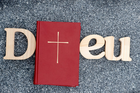 Wooden letters forming the word Dieu (god) with Bible on a background of black marble. Christian symbol.