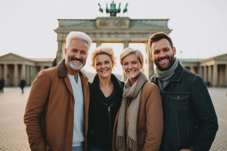 Group of happy friends standing in front of Brandenburg Gate in Berlin, Germany