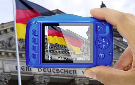 Taking picture of Reichstag (parliament) building in Berlin Germany camera display pov