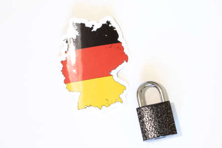 Germany national flag with outline on a white background with a closed lock top view. The concept of closing the borders of the country. Country isolation.