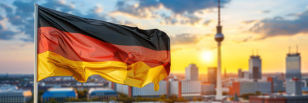 Germany flag waving with city skyline in the background, symbolic urban landscape