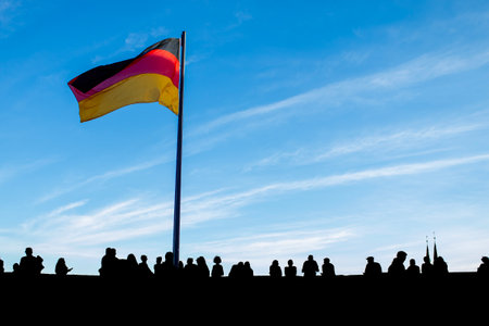 The German flag takes center stage among the silhouetted crowd for national holiday decoration.