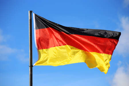 German flag fluttering in the wind with the blue sky with white clouds in a background
