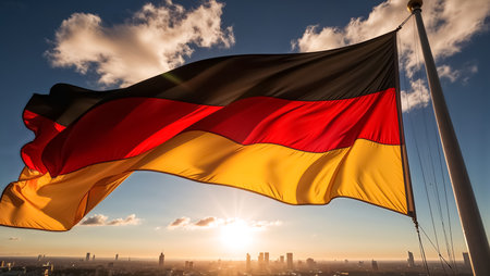 Flag of Germany waving in the wind at sunset