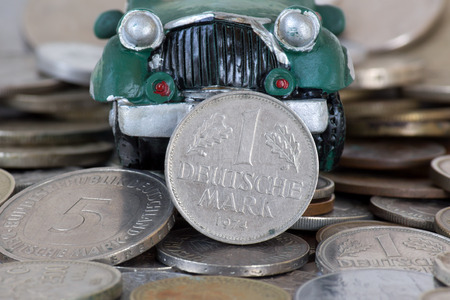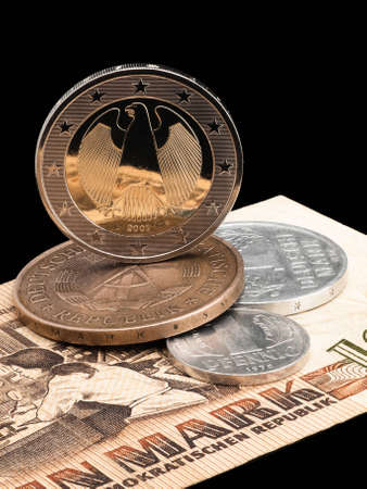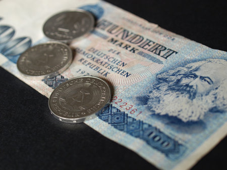 Vintage looking 100 Mark banknote from the DDR (East Germany) with 1 Mark coin - Note: no more in use since german reunification in 1989