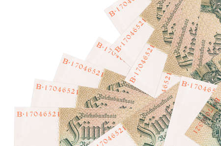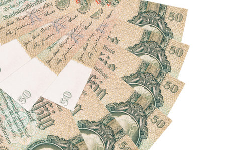 50 Reich marks bills lies isolated on white background with copy space stacked in fan shape close up. Financial transactions concept