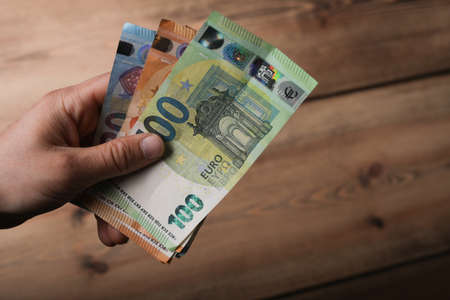 Selective focus on detail of EURO banknotes. Counting or giving EURO banknotes. World money concept, inflation and economy concept