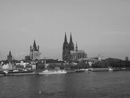 KOELN, GERMANY - CIRCA AUGUST 2019: View of the city skyline from the river in black and white