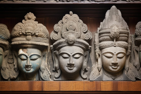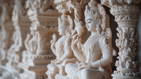 Elaborate stone carvings of deities adorn the columns of an ancient temple, showing intricate details and craftsmanship under gentle sunlight, highlighting their heritage.