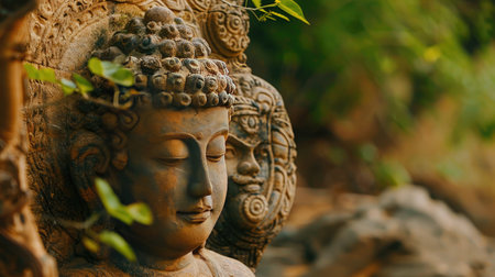 A detailed shot of an ancient stone sculpture with intricate carvings, leaving ample room for copy space.