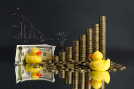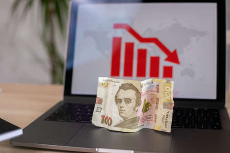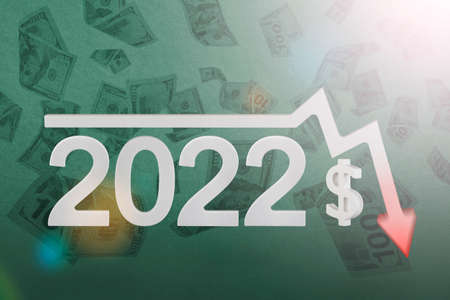 Crisis 2022. Quarterly or annual report of companies. Economic recession on the chart. Chart arrow pointing down against falling chart and dollar symbol