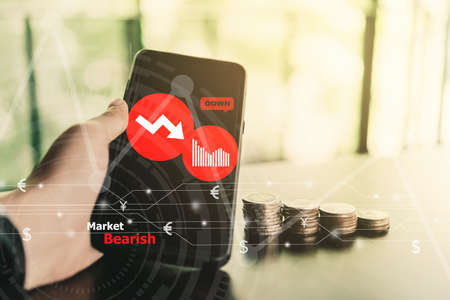 recession and stagnating economy conceptual image with text over shopping bag with graphs showing growth stats going down