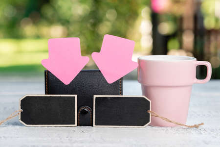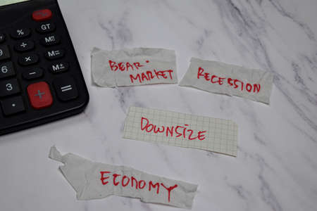 Inflation and recession conceptual image, economic terms on marble desk fading away from the camera
