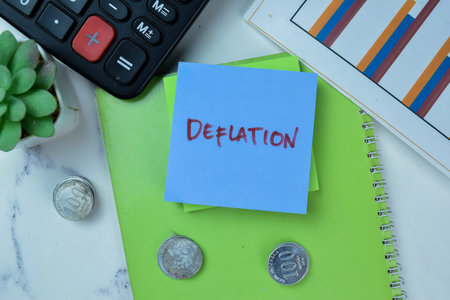 Concept of Deflation write on sticky notes with Indonesian Currency isolated on Wooden Table.