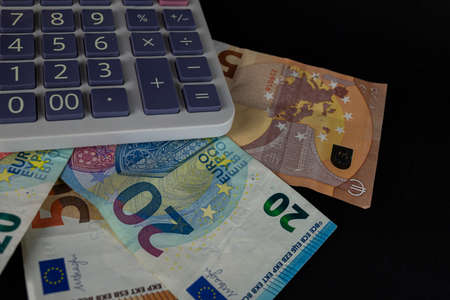 swiss banknote of ten francs, coin, crumpled paper ball and calculator on the blue background