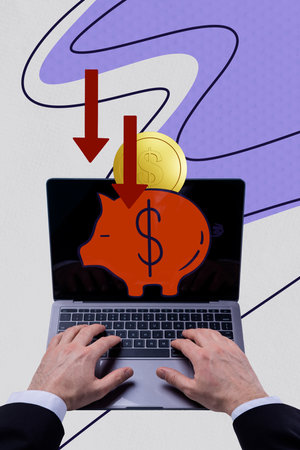 Poster sketch image artwork 3D photo collage of rich wealth bank salary income deposit ssave money piggy ebank hand hold laptop trader