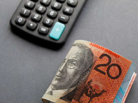 laptop, calculator, digital camera and money, store selling photographic equipment, pawnshop concept, closeup