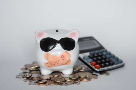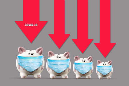 Piggy bank pigs in medical masks. Reduced savings during a pandemic. Finance. Business.