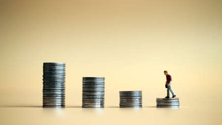 Miniature tiny people toys photography. People standing above coin stack does not have money or bankrupt, stock market candle chart fell down, isolated on white backgrounds.