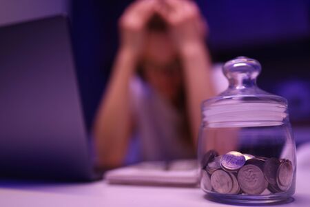 Close-up of glass container with coins. Depressed woman calculating family financial situation. Person close face with hand. Saving up for future. Money and investment concept