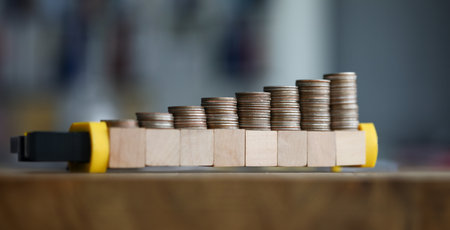 Money growth concept, where small coins in a pile gets bigger and higher for each pile . Stock Photo