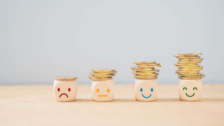 emotion face on stack of coins, saving money, deposit, wealthy, profit, cash for health budget or insurance concept