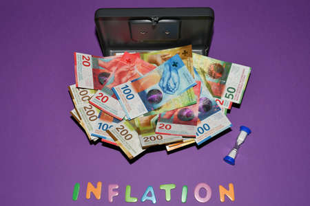 Vaduz, Liechtenstein, November 22, 2021 Bills in the swiss currency filled in a saving box and the word inflation