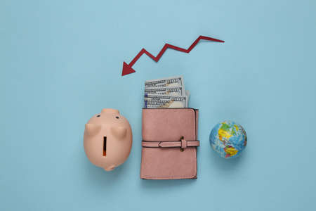Global Financial Crisis Concept. Fall arrow, piggy bank, wallet and globe on blue background