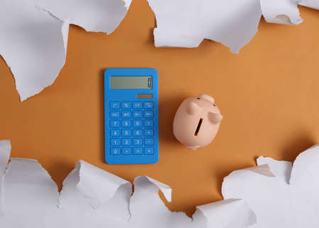 Calculator with piggy bank and white torn paper sheets on beige background. top view