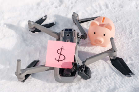 Broken gimbal camera and drone motor arm after crash, sticky note with dollar sign and piggy bank on snow in winter outdoor closeup. Expensive repairs concept