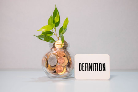 A high angle view of pesos in a jar with a blue [2020] sticker on it on the table under the lights