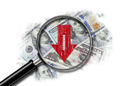Business fall concept. Red down arrow on a background of dollar bills. View through a magnifying glass. Isolated on a white background. Business. Finance. Background.
