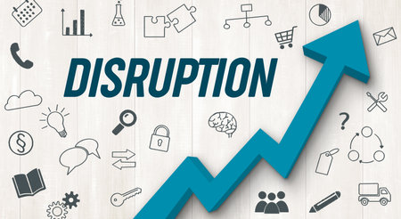 Disruption, word in wooden alphabet letters isolated on blue background as banner headline with effects added