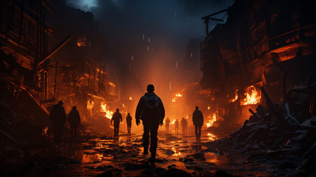 Individual navigating a devastated village engulfed in fire and smoke, illustrating concepts of crisis, destruction, and resilience under dire circumstances.