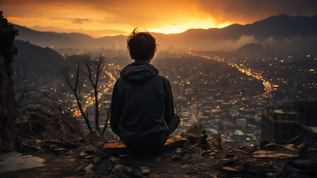 Rear view child looking at buildings and cityscape destroyed in the earthquake. Generative AI