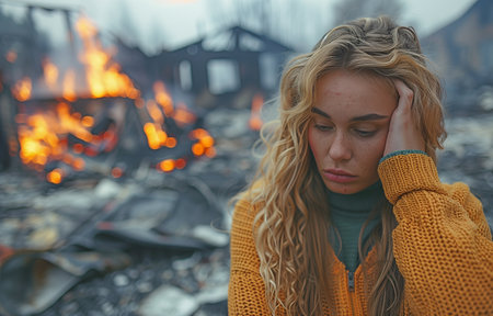After a fire tragedy, the dejected woman homeowner checks the burned-out house and garden with his hand.