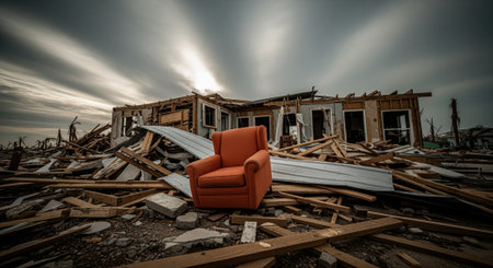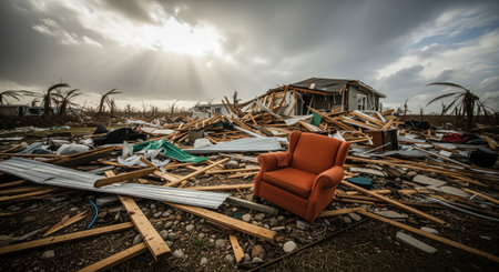 Collapsed residential building and widespread debris after a devastating hurricane. an orange armchair stands amidst the destruction, under a dramatic, cloudy sky with sun rays. symbolizes loss and the impact of extreme weather events.