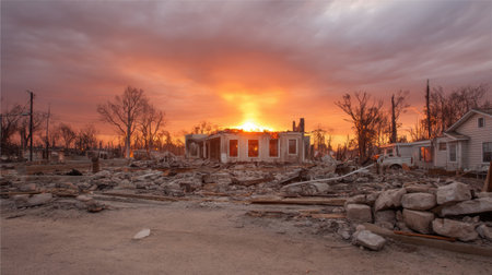 This powerful image captures the haunting aftermath of destruction. The scene is filled with debris under a cloudy sky, reflecting resilience amidst chaos. Generated A.I.