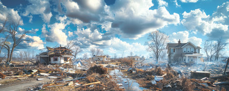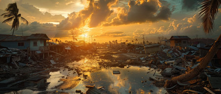 Devastation unfolds along a quiet coastal village where homes and boats lie scattered after a monumental storm. Debris strewn across the landscape showcases nature's fierce power and resilience.